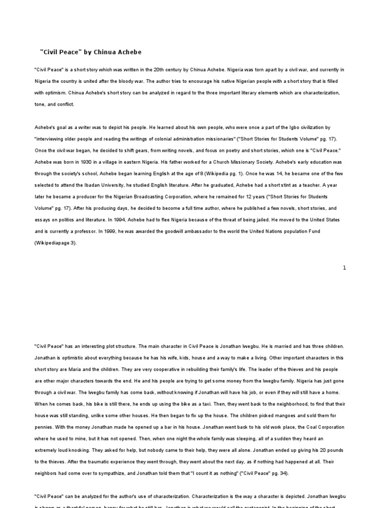 The story is about a Biafran civil war and its effect on the lives of ordinary Nigerian people. The well-known Nigerian author Chinua Achebes short story Civil Peace is a realistic story which presents the condition immediately after the Civil War. Achebe combines straightforward English with a patois based on the.